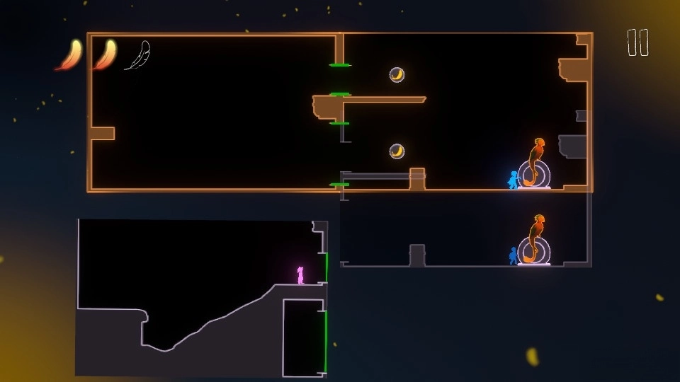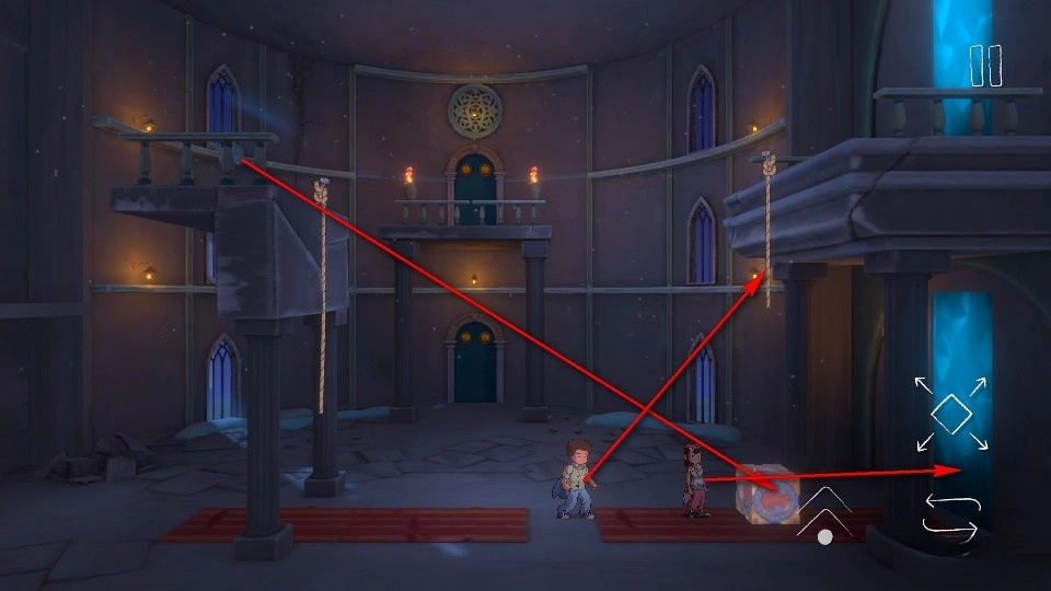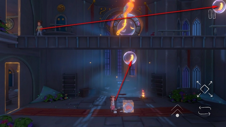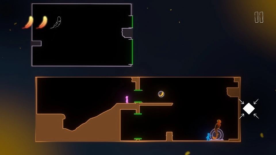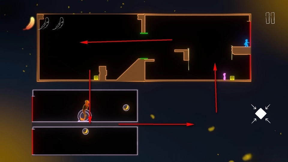 下方的角色需要推动箱子到羽毛下方,拾取到羽毛后便可推着箱子到绳子底下垫脚爬上绳子,拾取完上层的羽毛后便可成功通关。