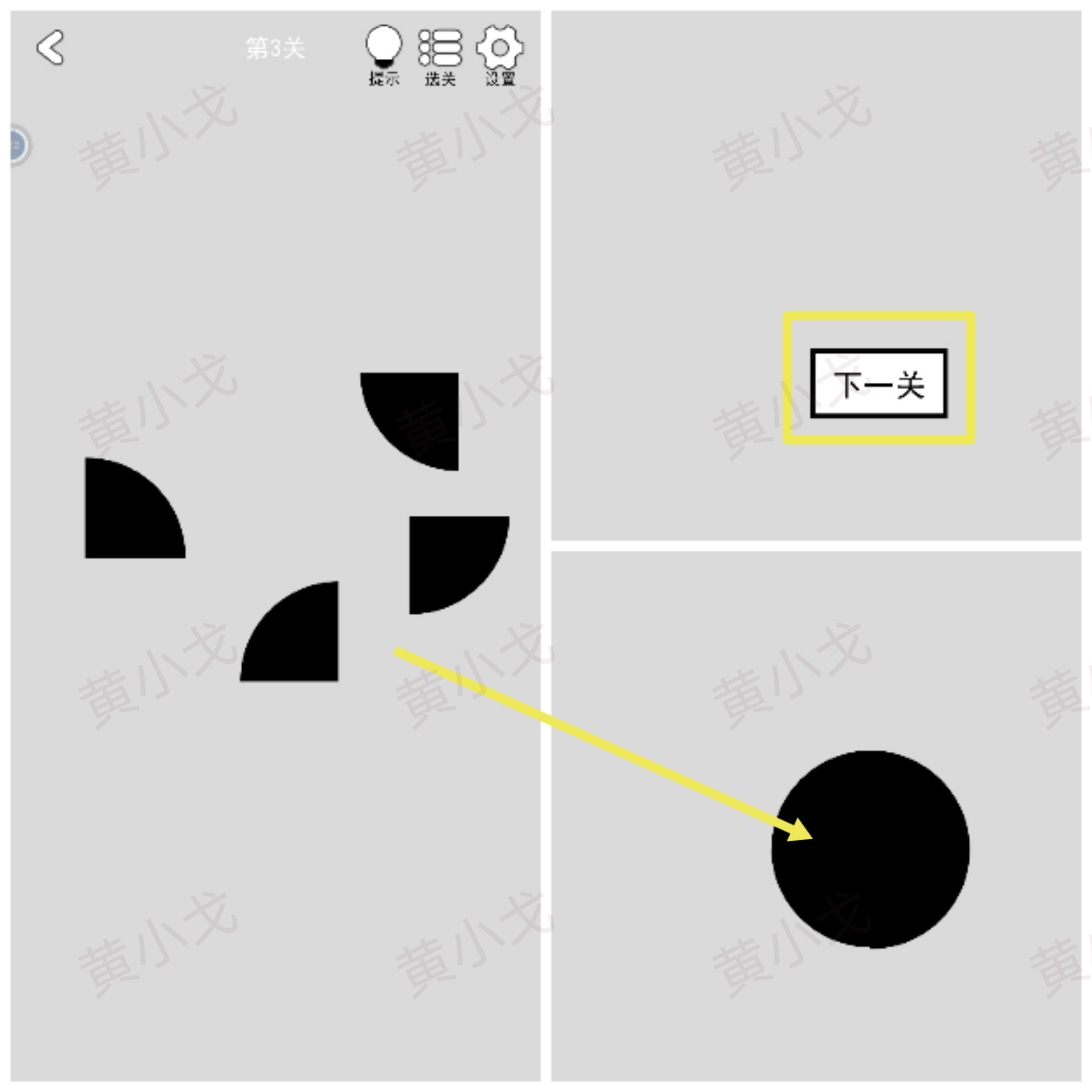 把四块碎片拼成圆形,点击下一关按钮