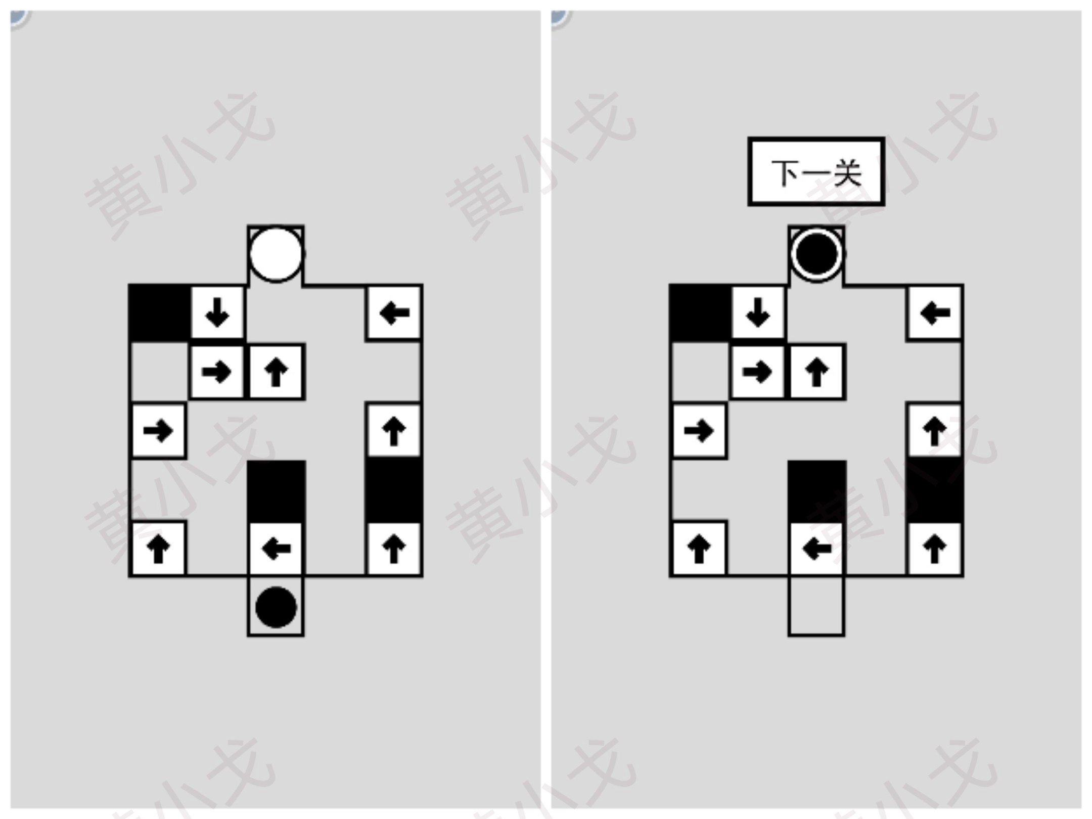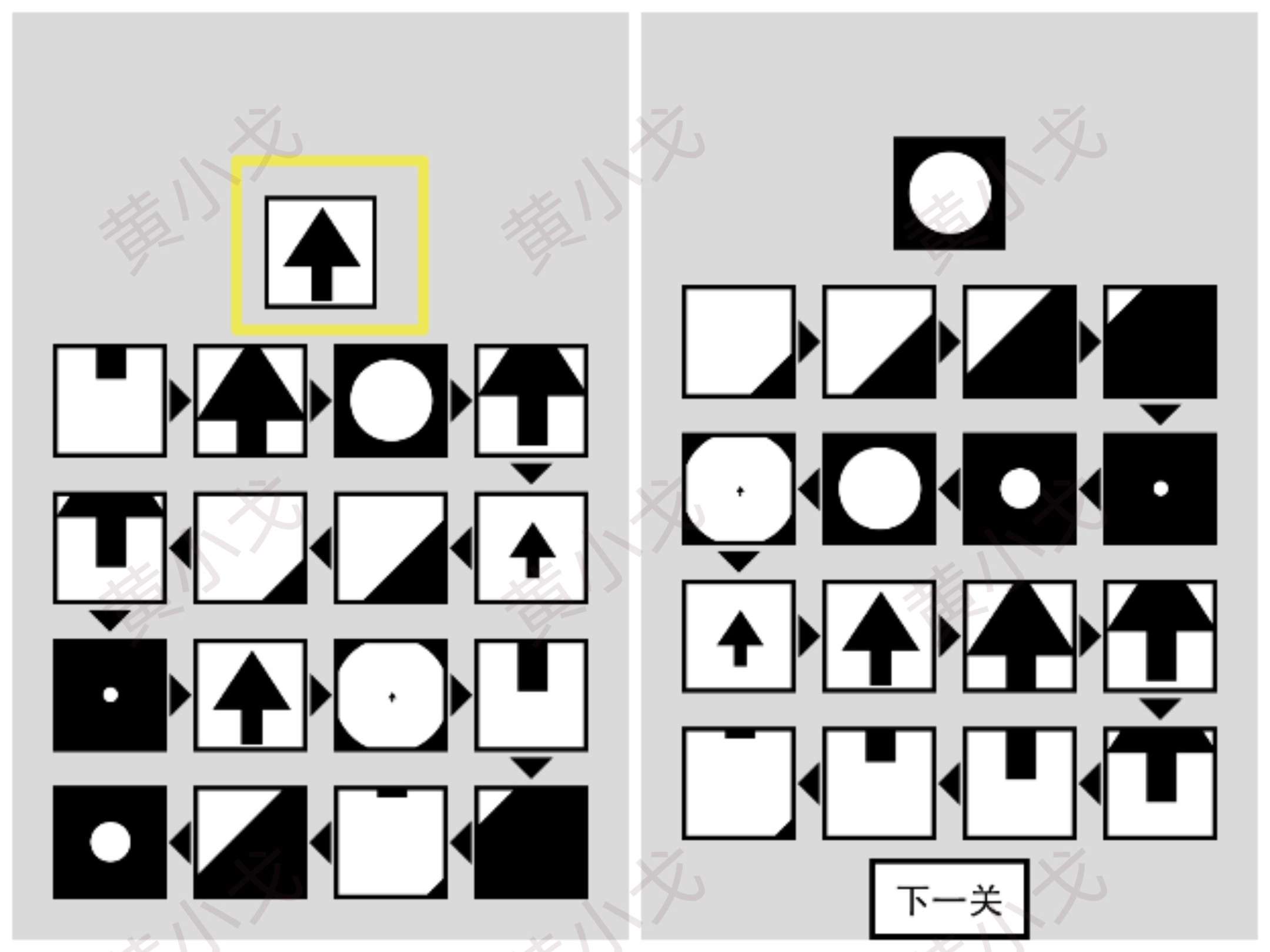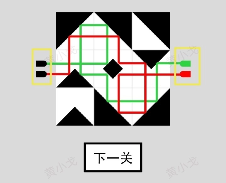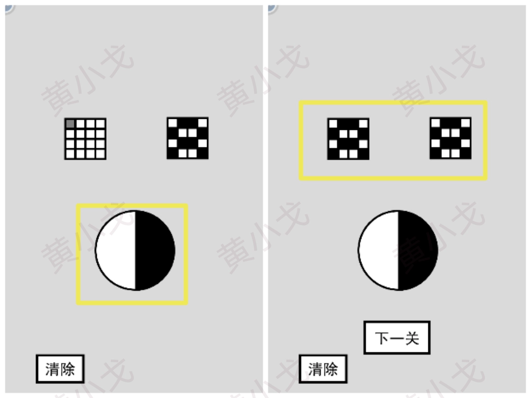 点击黑白按钮,调整小方块的颜色,让左边的图案和右边的图案完全相同;然后点击下一关按钮。