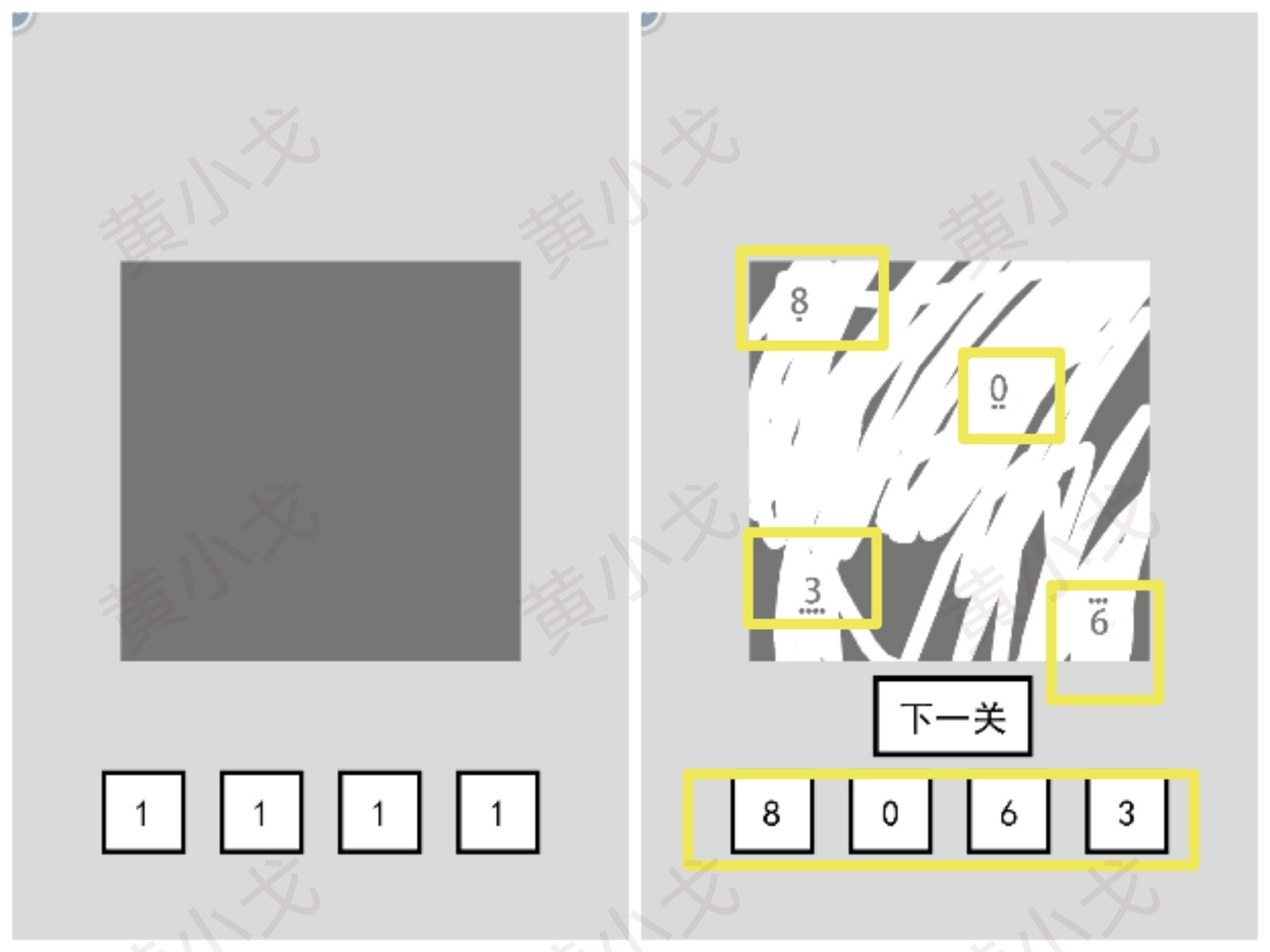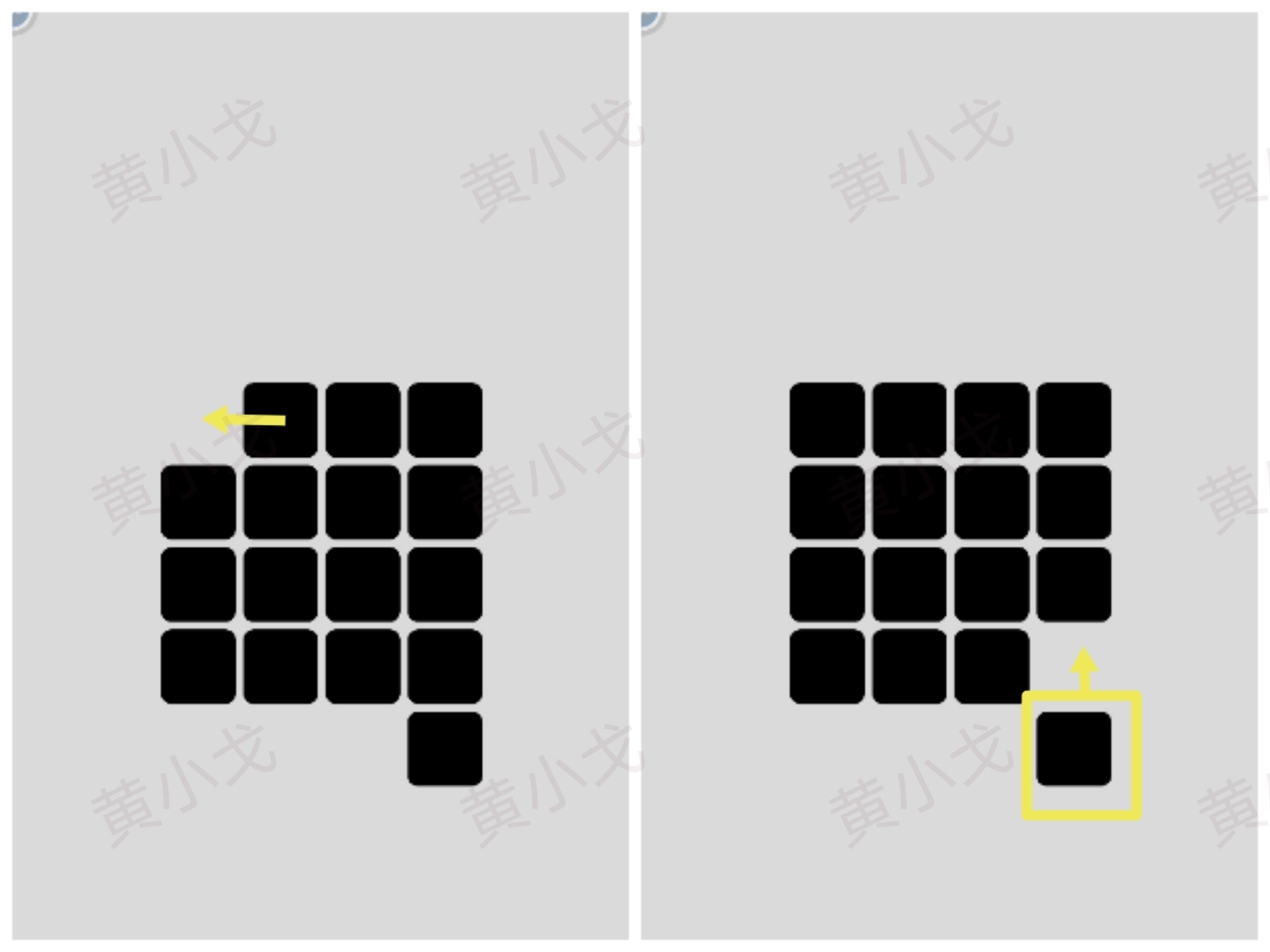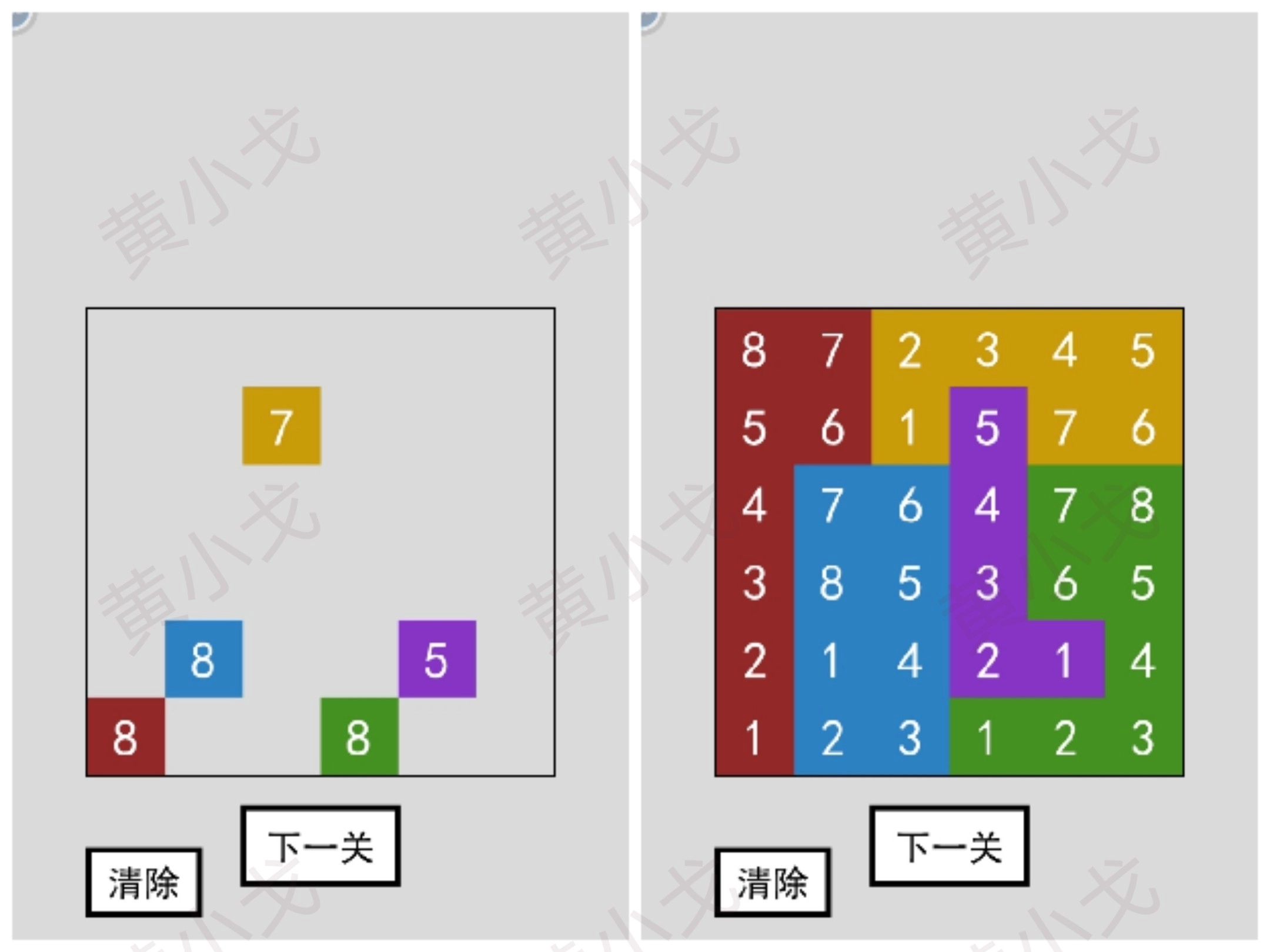 点击黑白按钮,调整小方块的颜色,让左边的图案和右边的图案完全相同;然后点击下一关按钮。