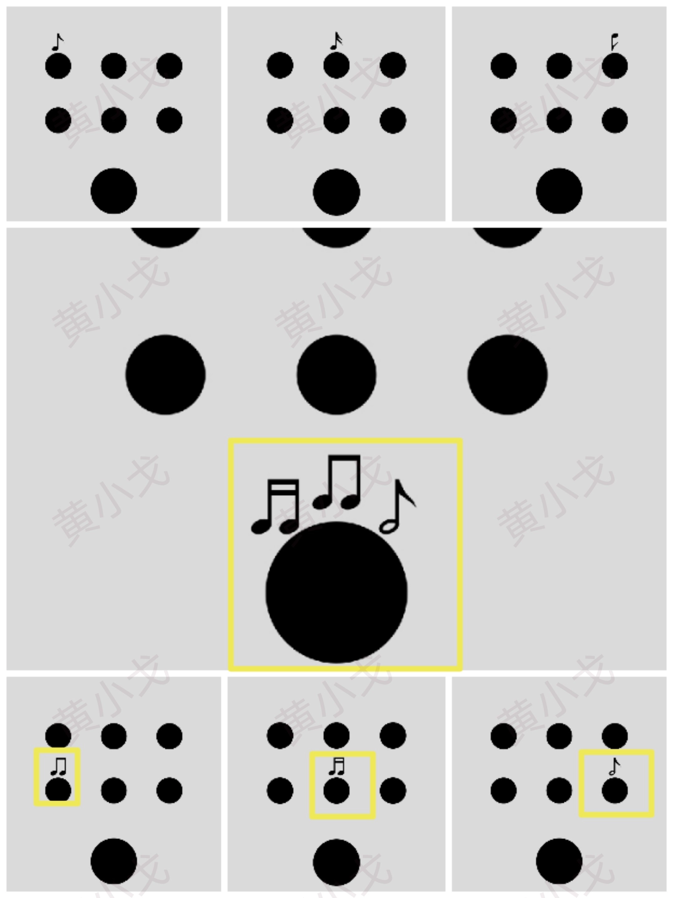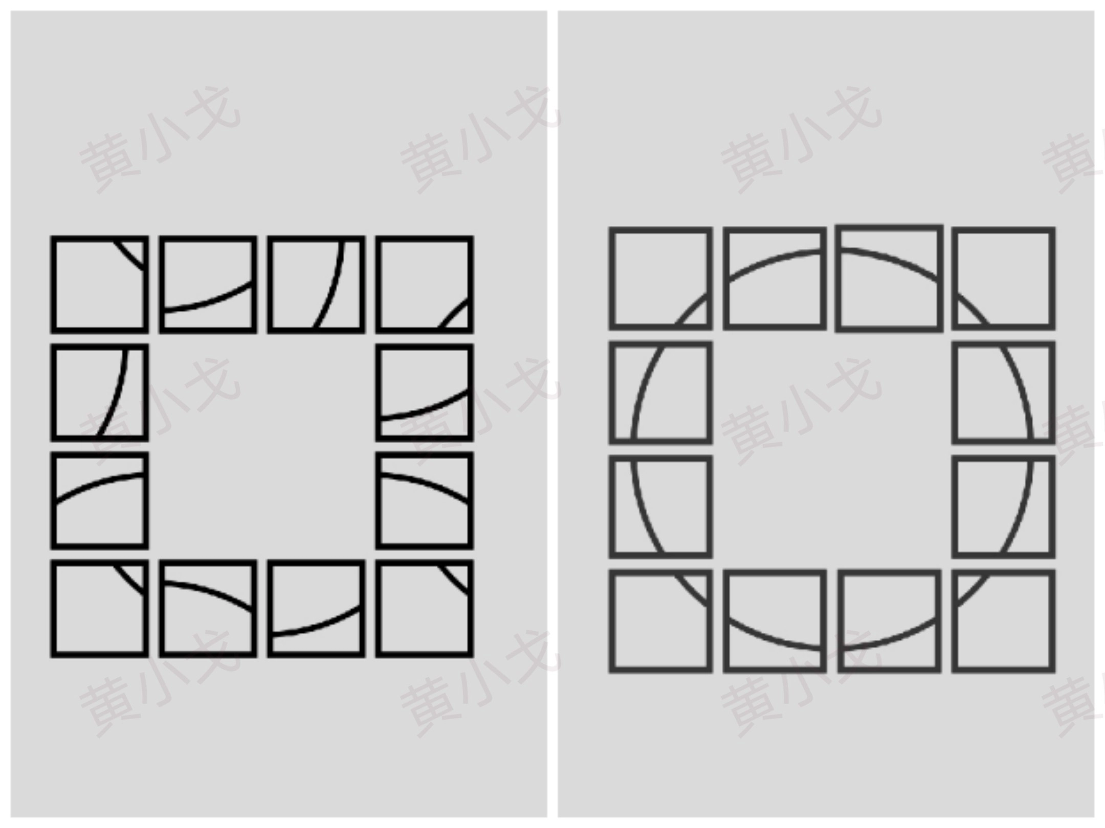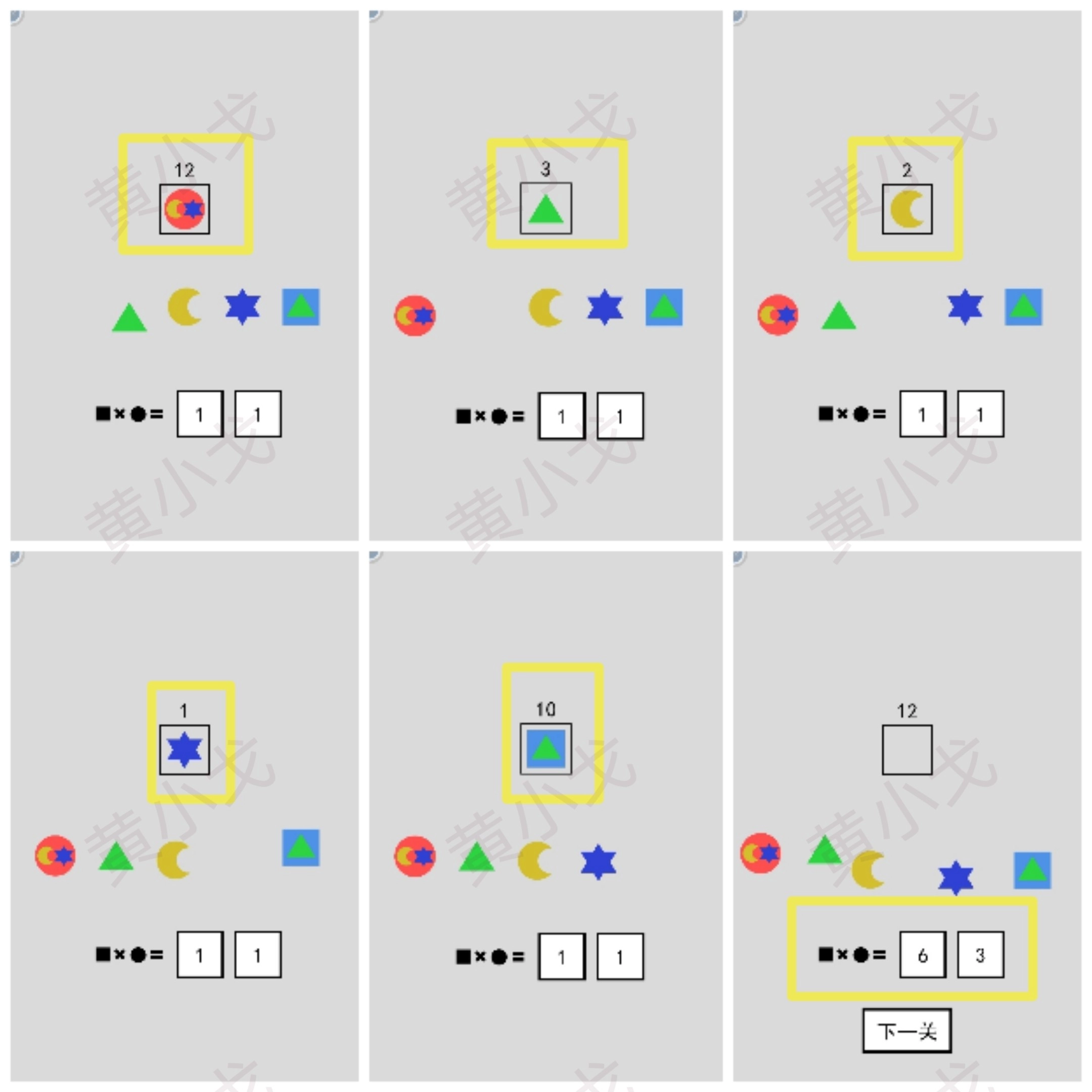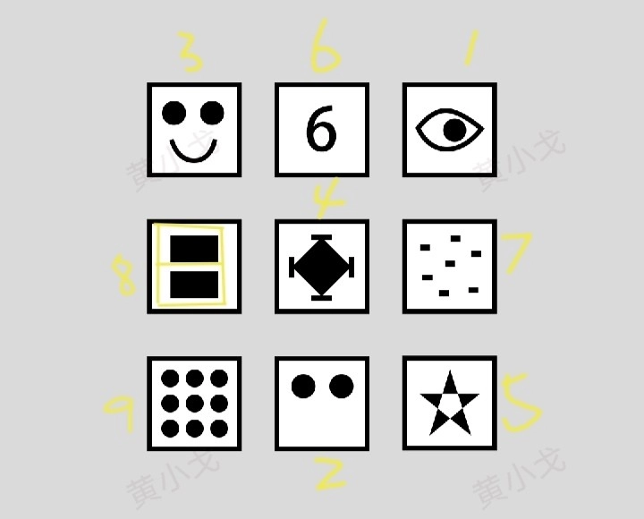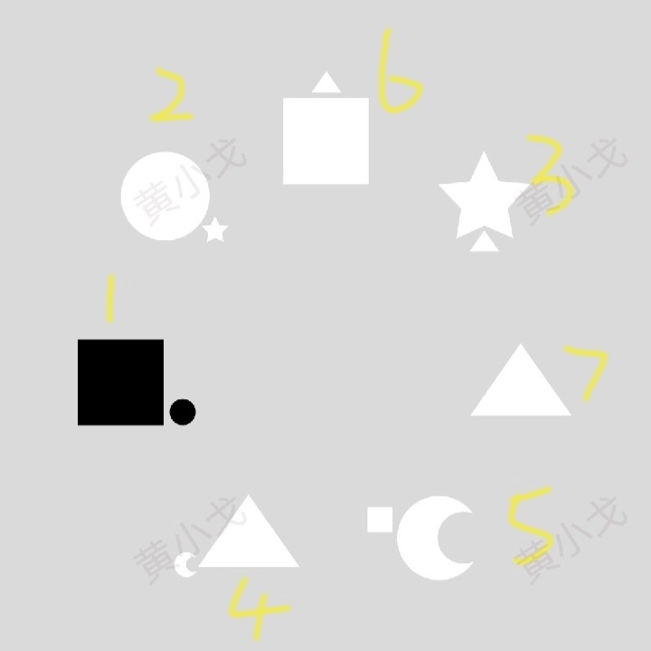 在图形序列中存在这样的对应规则:每个阶段中,与较大图形相邻的较小图形,会成为后续阶段里占据主要位置的较大图形。具体的转换顺序呈现为:最初以四边形形态出现的图形,后续会对应到圆形;圆形之后衔接的是五角星形;五角星形的下一个对应图形是三边形;三边形之后则会转换为月牙形;月牙形结束后又回到四边形;而四边形的下一个对应图形是三边形。