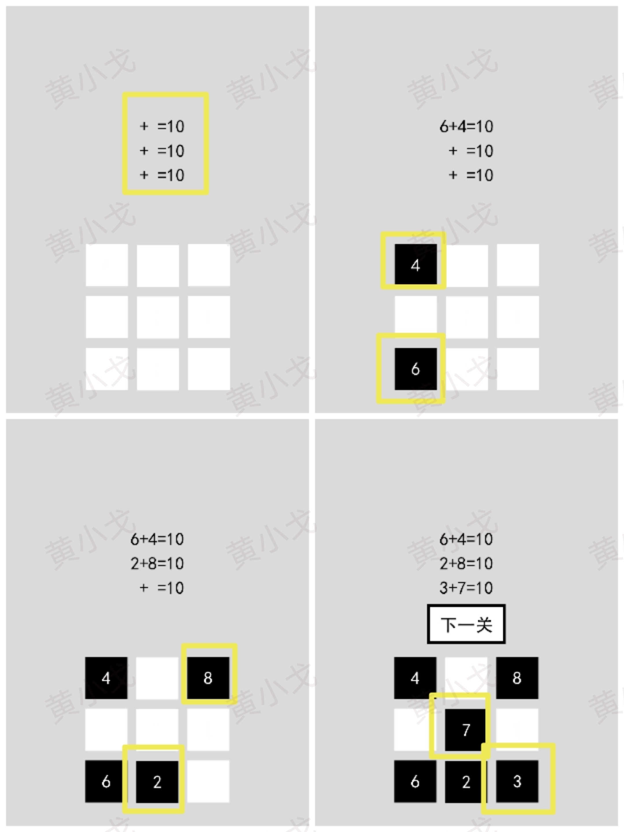按照给出的等式提示,找出方块上能凑成10的数字组合;完成后点击进入下一关的按钮