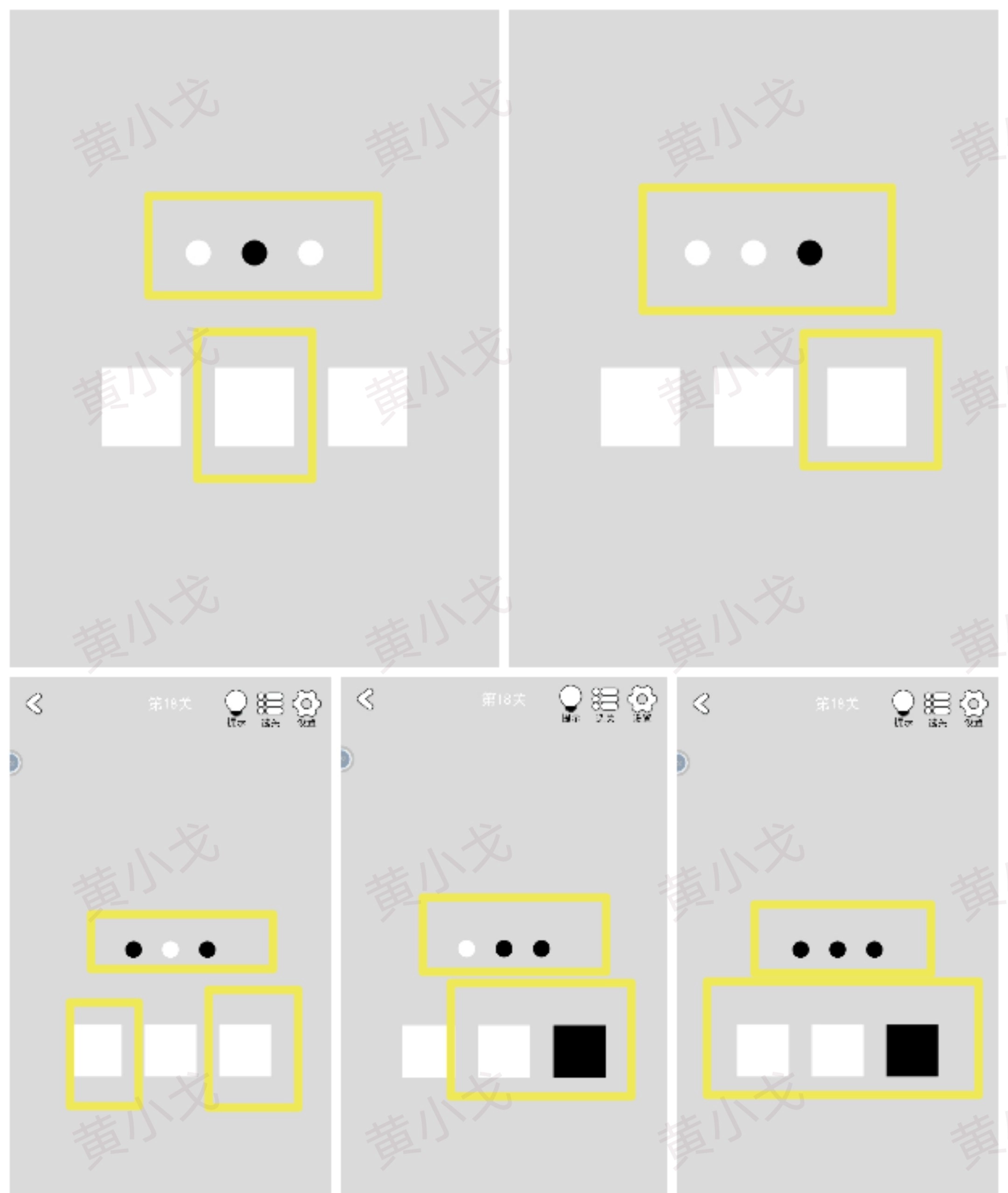根据白圆所在的位置,依次点击两个按钮,让所有白圆都变成黑圆,然后点击下一关按钮。