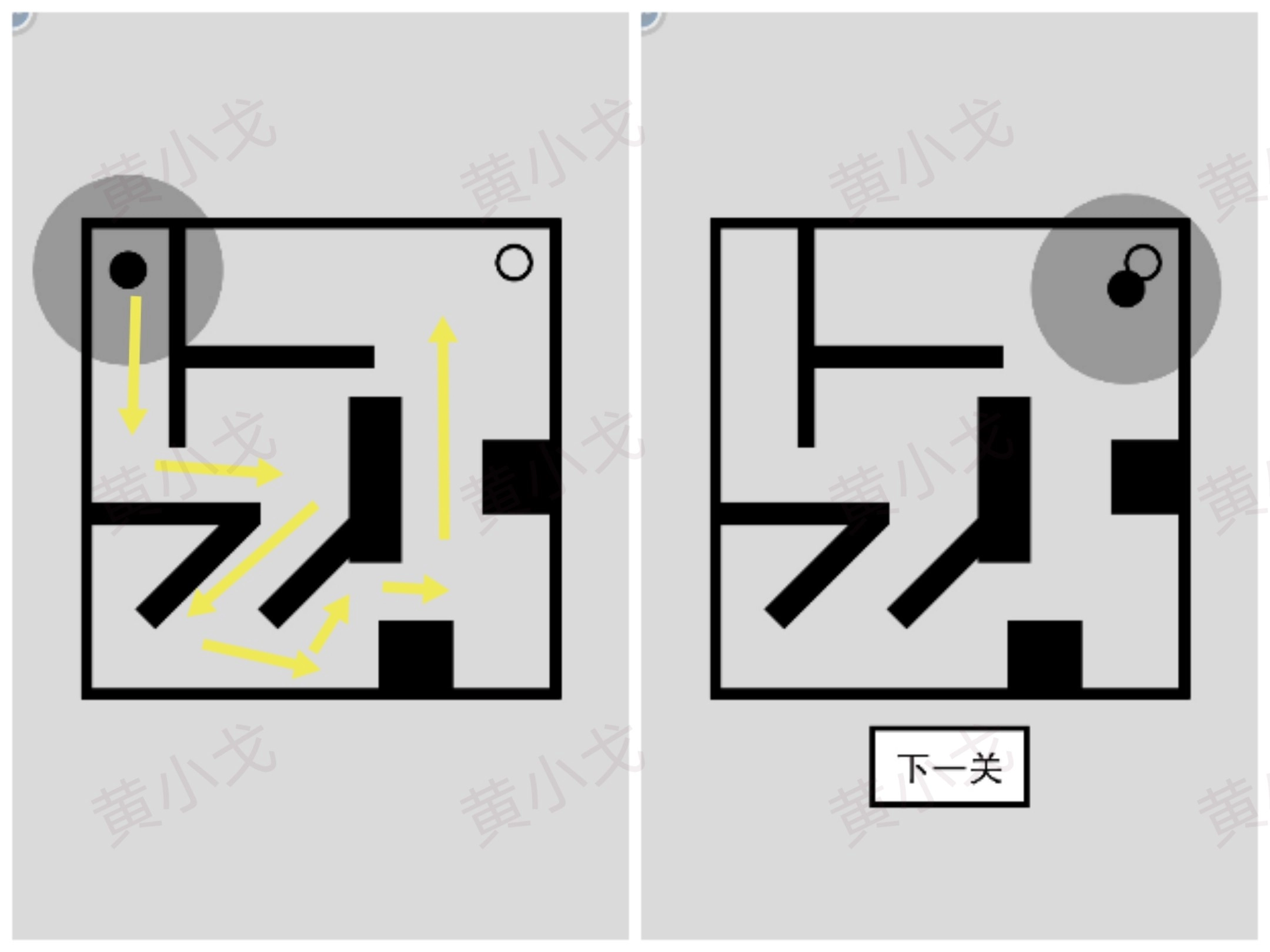 控制黑色圆形在迷宫中移动,目标是到达白色圆形的位置,移动过程中需避开所有方块障碍;完成当前关卡后,点击界面上的对应按钮进入下一关。