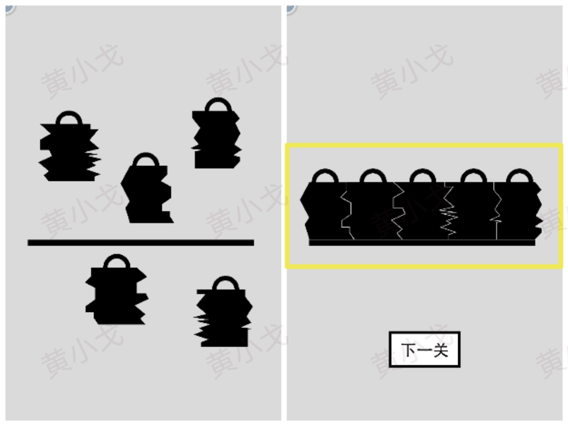 拼出小四方格里的图案,共四个;点击下一关按钮