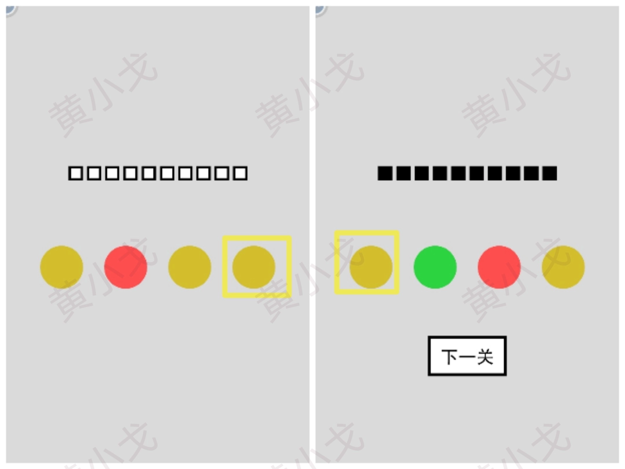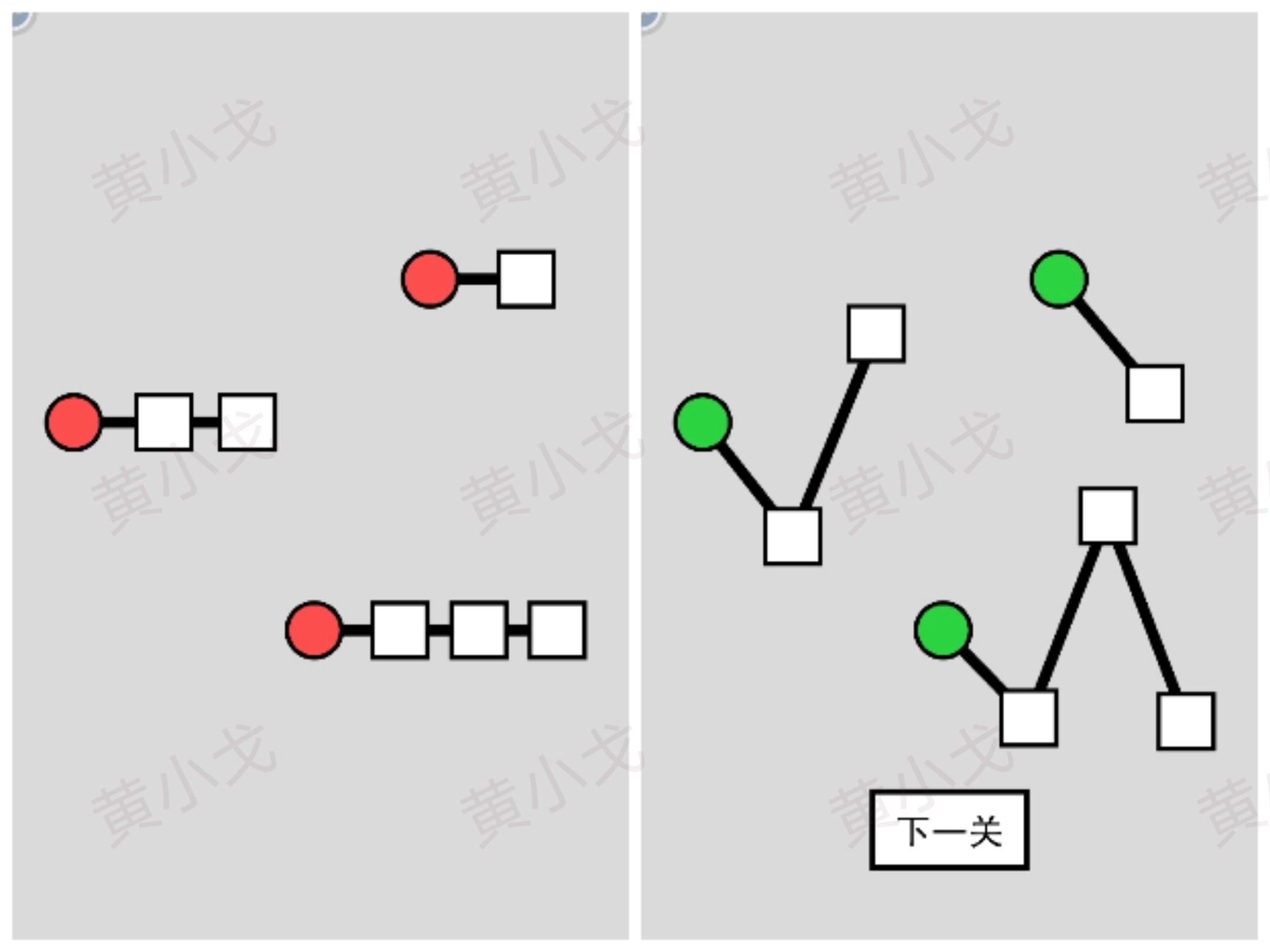 把方块放到正确位置,红圆变绿圆;点击下一关按钮