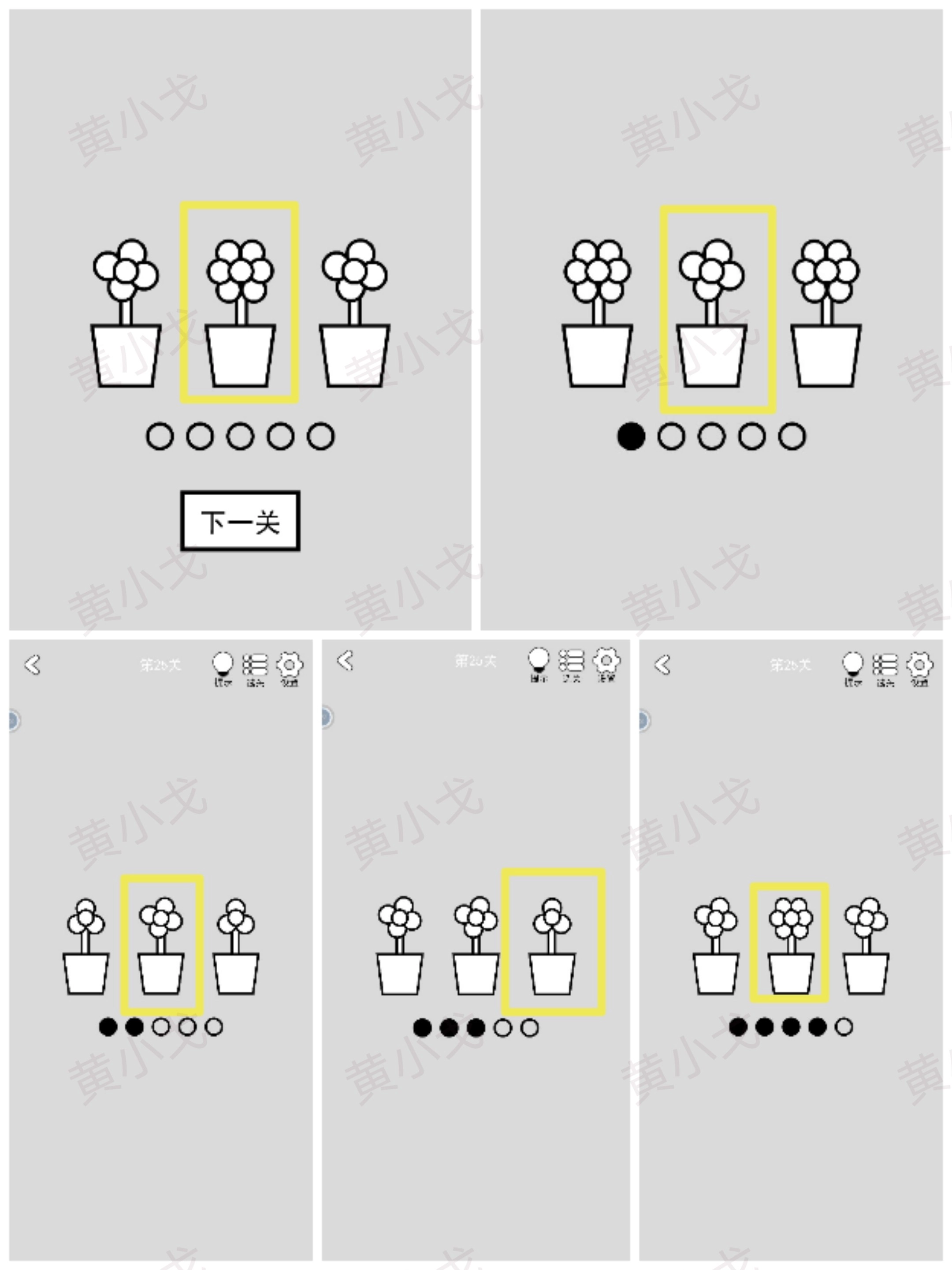 从五组花朵里分别挑选每组中花瓣数量不一样的花,选完后点击进入下一关的按钮。