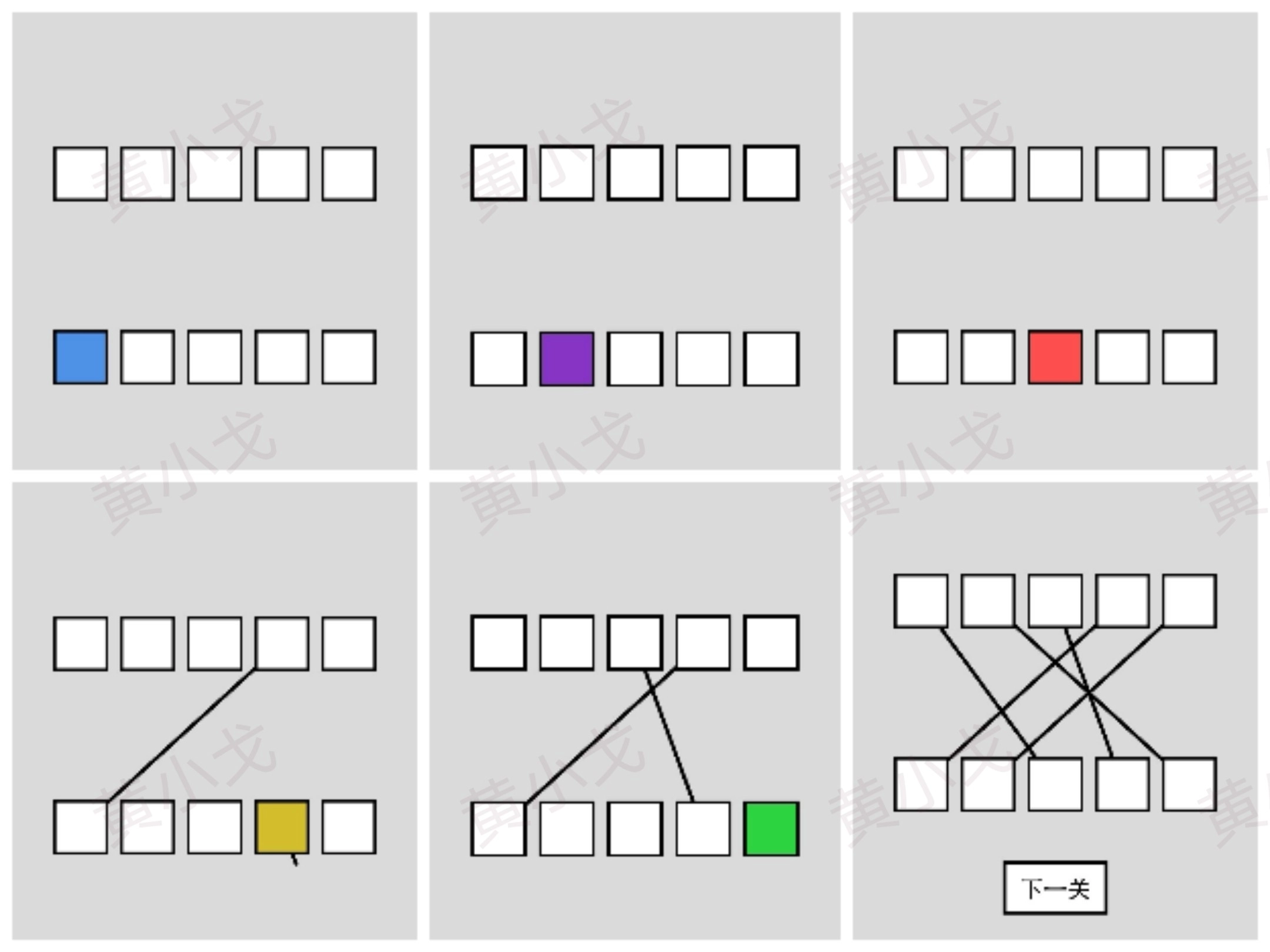 观察上下两排方块的色彩,将颜色一致的方块相互连接;完成后点击进入下一关的按钮。