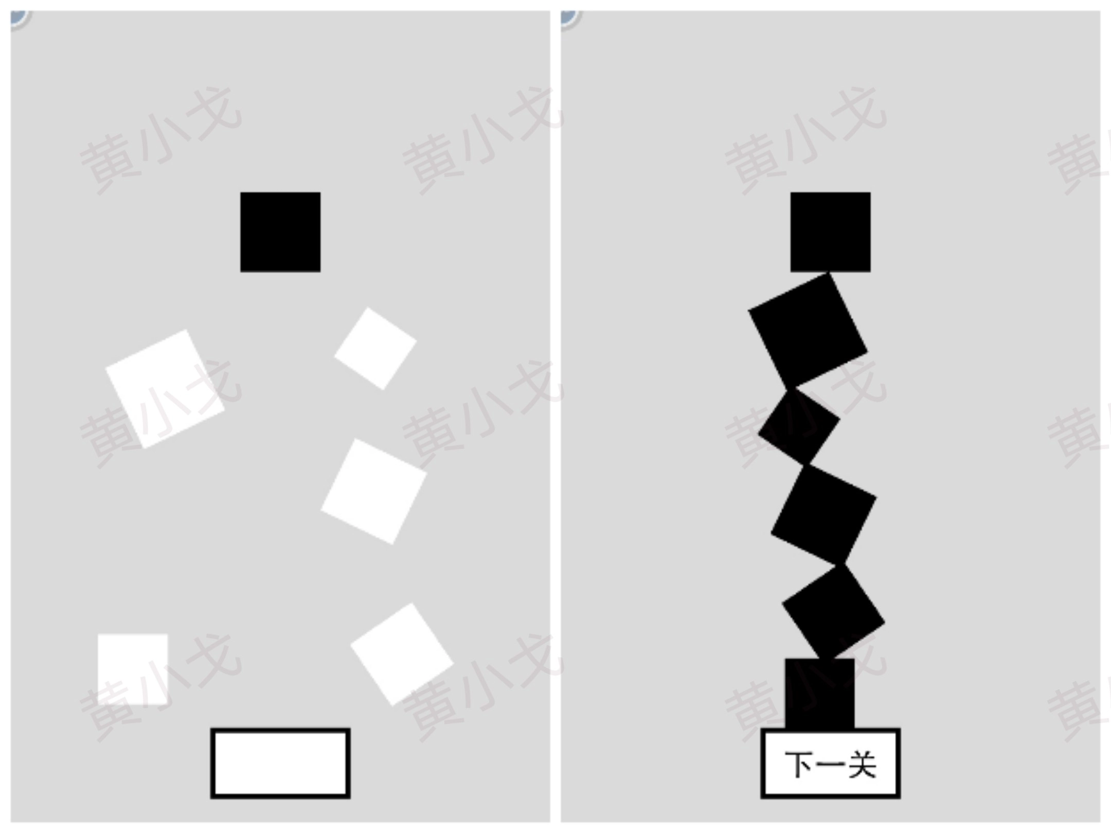 移动方块,拼成正方形;点击下一关按钮