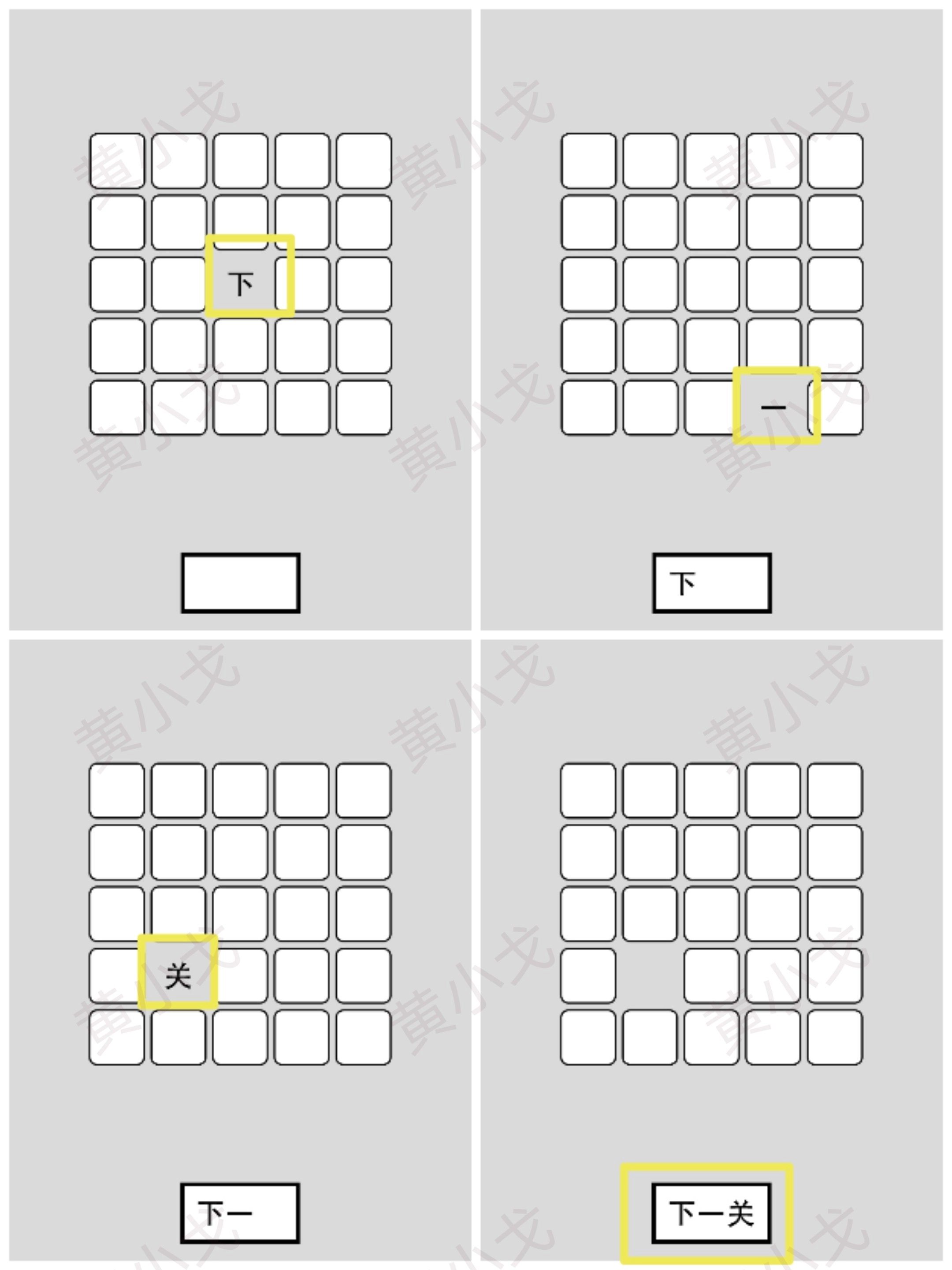 按特定的顺序点击方块;点击下一关按钮