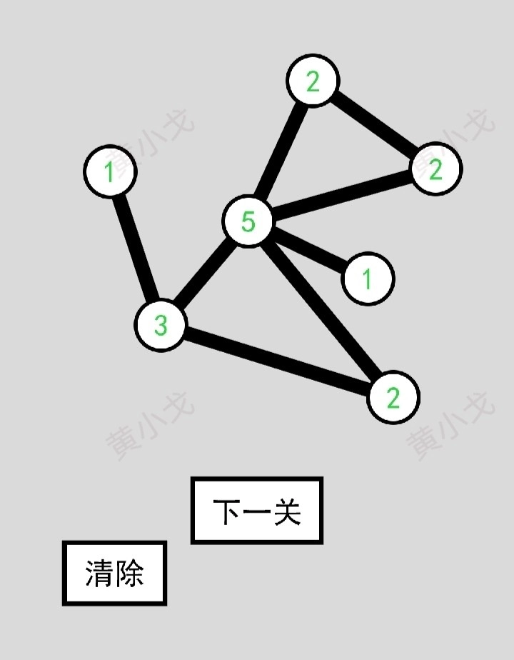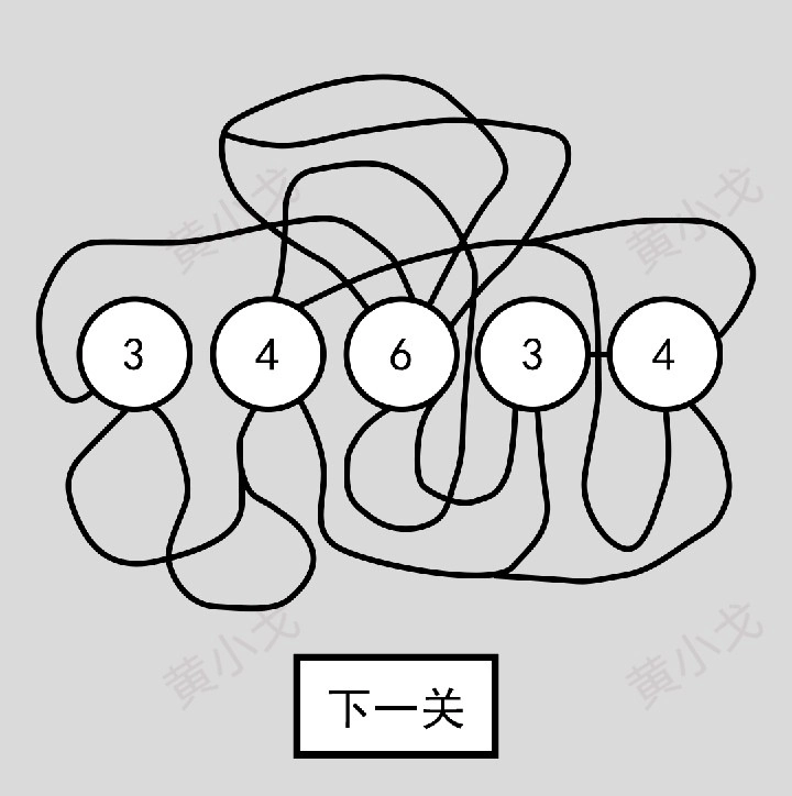 将圆圈连接起来,每个圆圈内的数字代表连接该圆圈所需的线条数目;点击“下一关”按钮