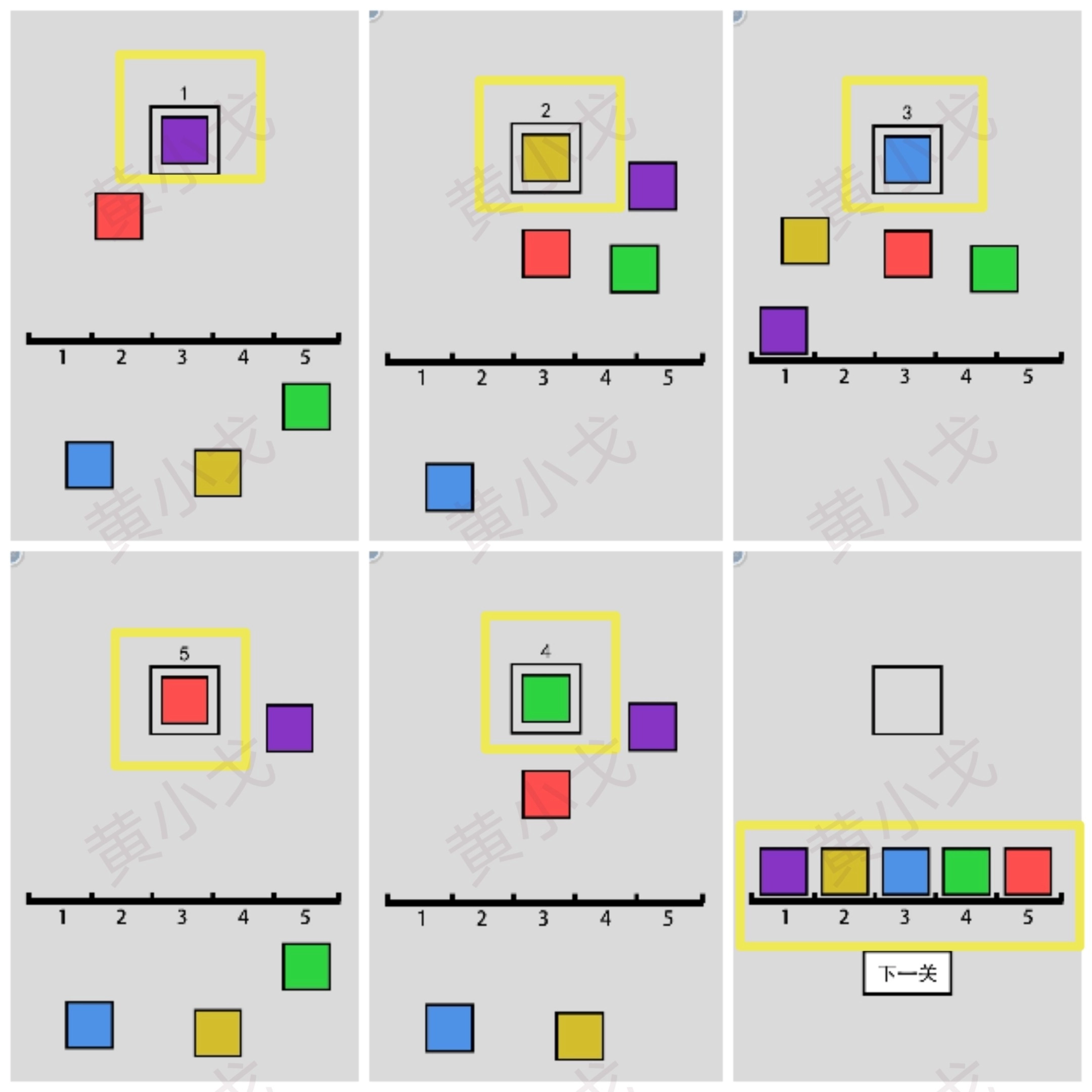 按特定顺序点击下方的方块;点击下一关按钮