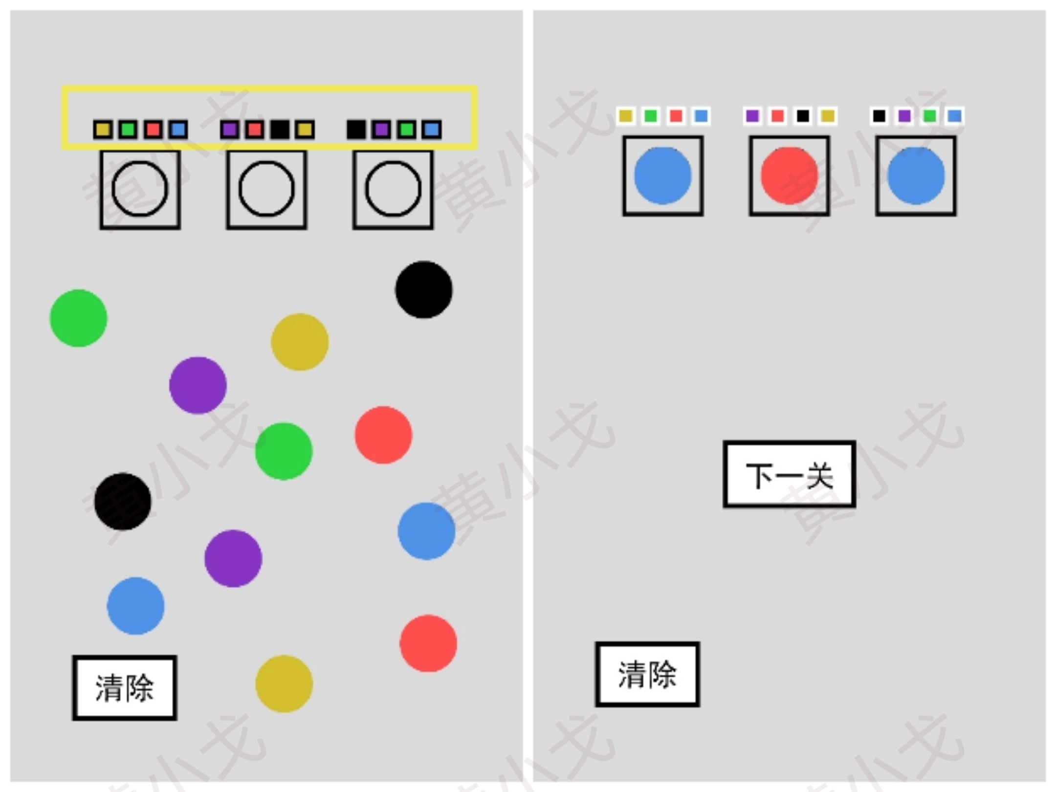 将圆圈两两组合,成功组合的圆圈会改变颜色;点击进入下一关的按钮