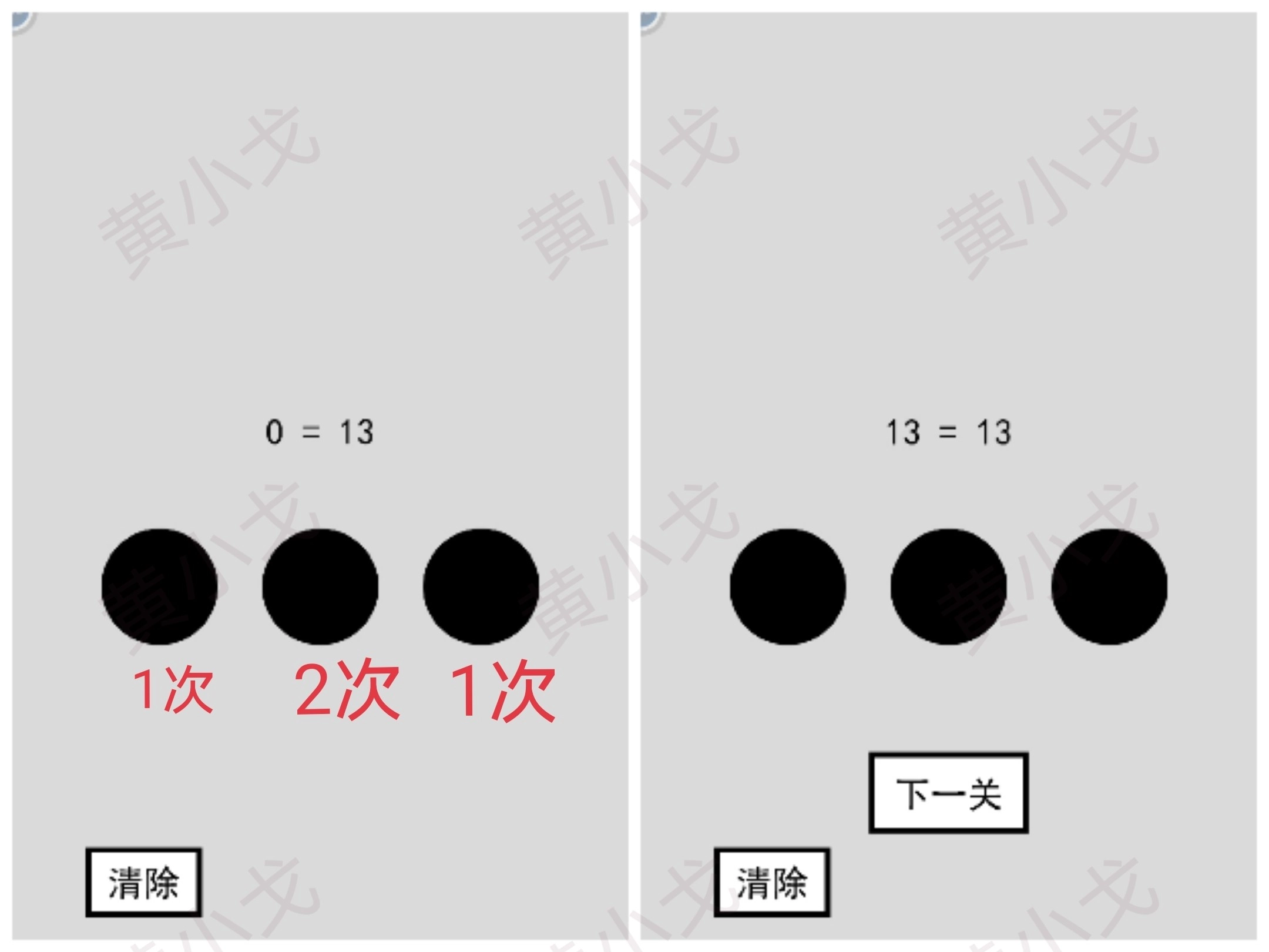 点击下方的三个按钮,让它们相加的数值等于13,然后点击下一关按钮。