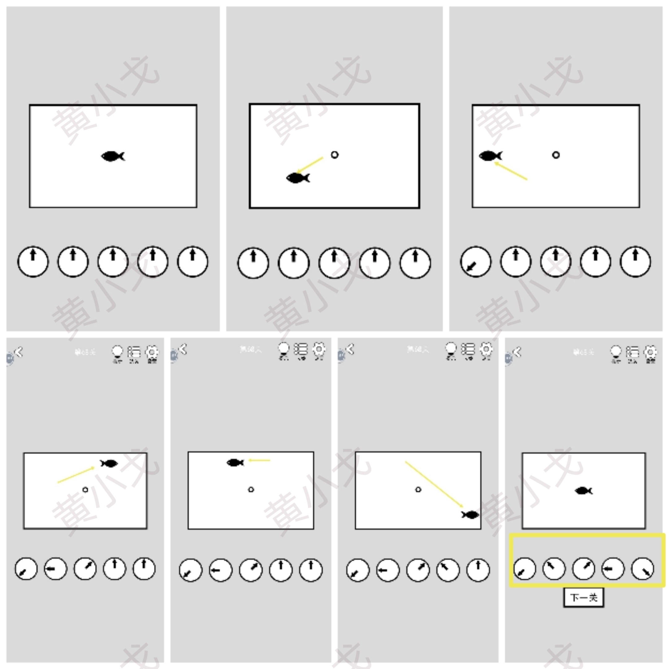 点击鱼,鱼会移动;系统会依据鱼与圆圈之间的角度、以及该鱼与上一条鱼所在位置的角度,来调整下方箭头的角度;点击下一关按钮即可进入下一关。
