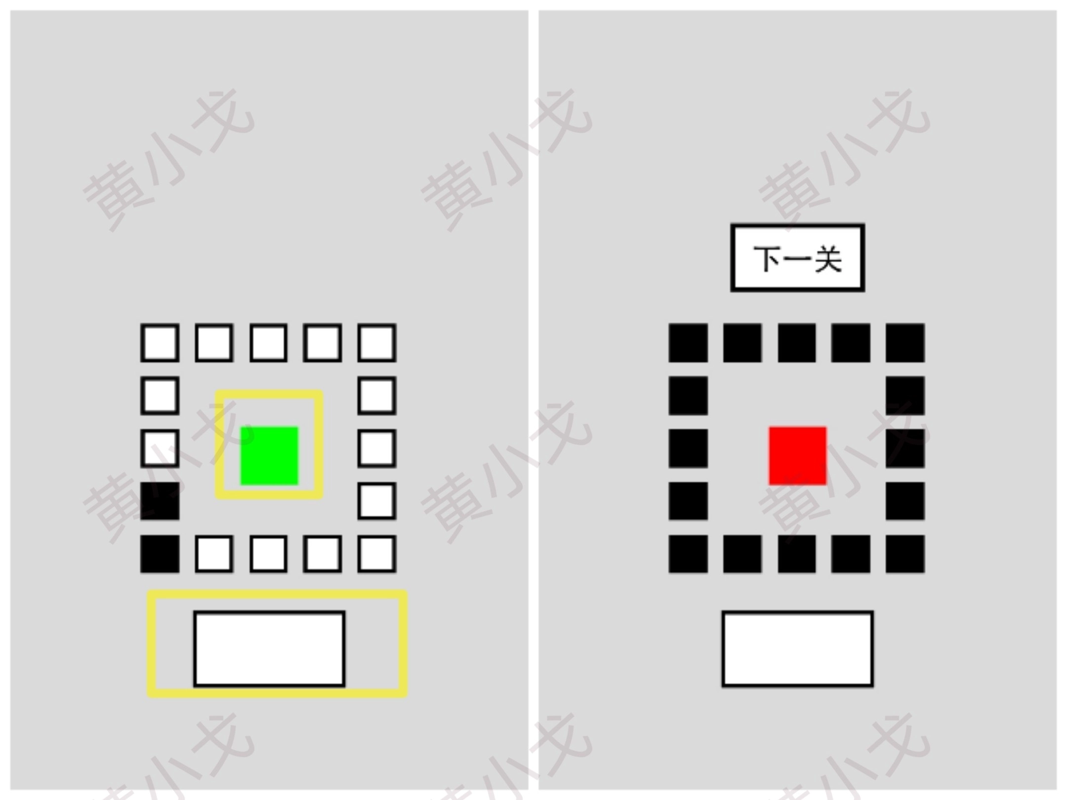 当界面上出现绿色方块时,点击指定按钮,让周围的白色方块全部变为黑色;完成后点击进入下一关的按钮。