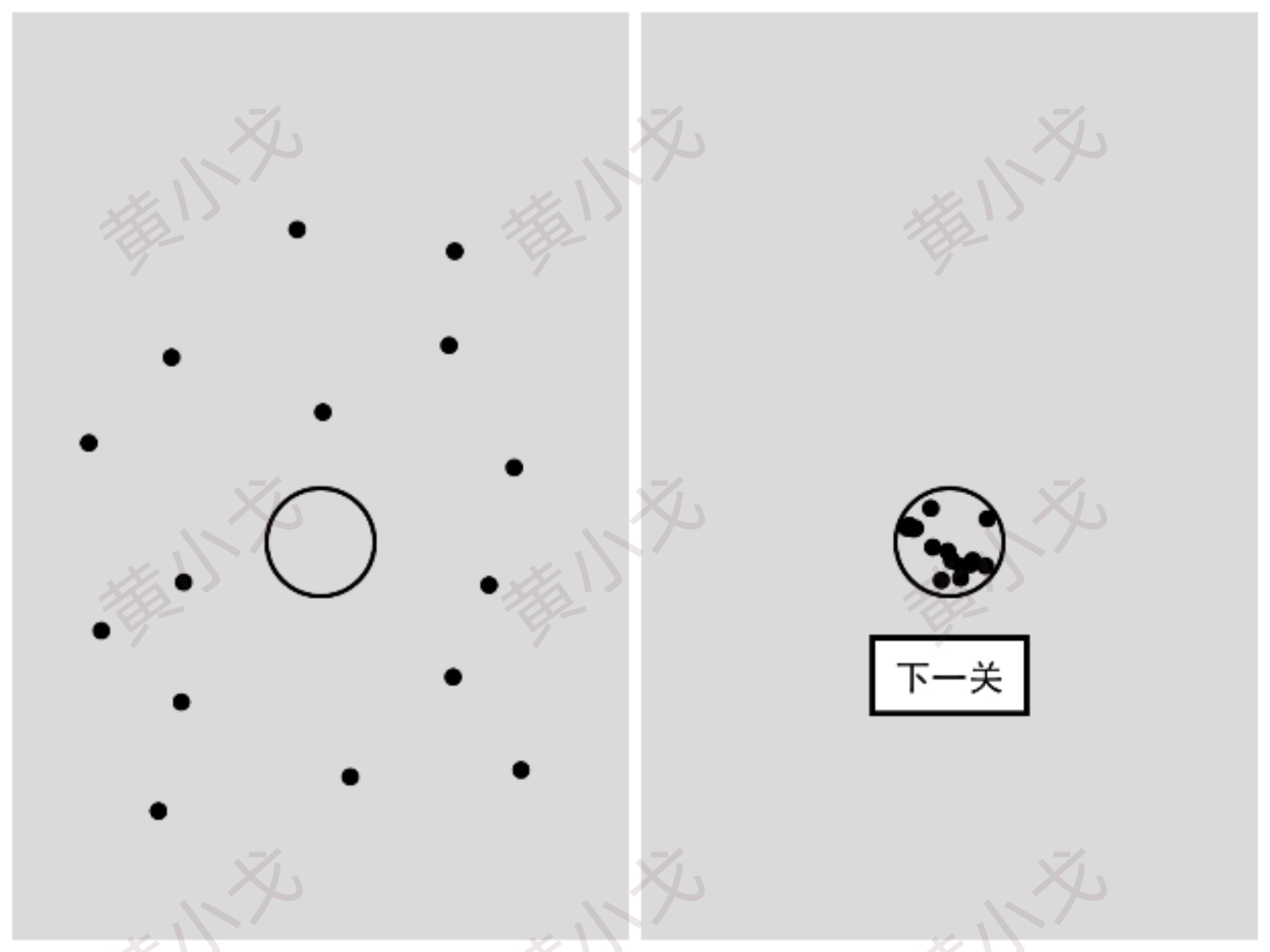 将黑点都移动到圆内;点击下一关按钮