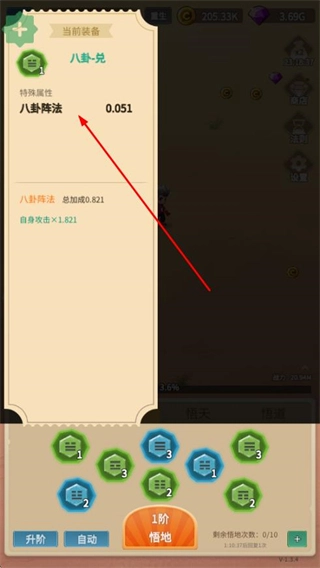 点击八卦装备后,弹出的界面会展示八卦阵法之类的特殊属性,你可以结合这些属性以及装备的总加成等信息来进行参考。