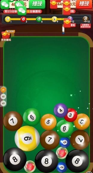 台球财运巧妙融合了台球玩法与2048的合成机制,玩家只需让相同等级的台球相互碰撞,即可完成合成升级——不仅能解锁更高级别的台球,还能领取丰厚奖励;后续开启自动掉落功能后,合成过程将更轻松,无需手动操作;随着台球等级逐步提升,还能获取更多福利。