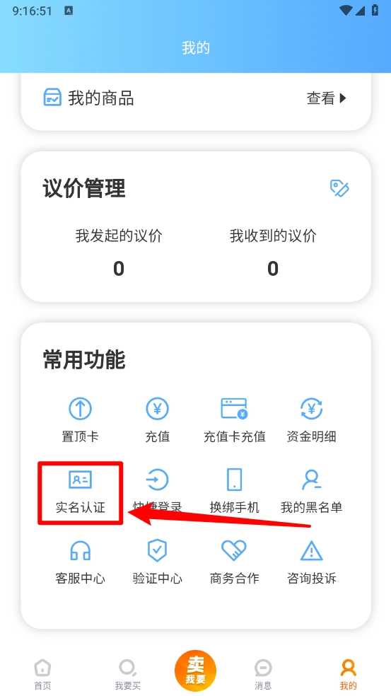 接着进入我的页面,在常用功能区域点击“实名认证”。