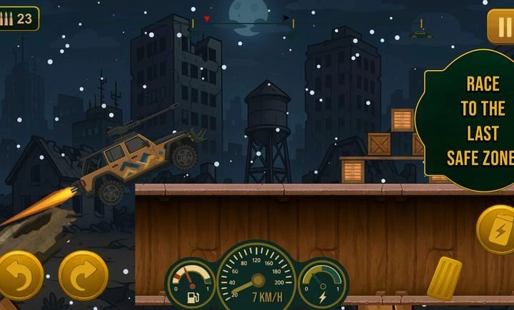 游戏采用经典的冲刺闯关玩法,你将驾驶各式车辆一路疾驰前往安全屋。通过收集更多金币,可升级各类设施、解锁更多车型,助力你跑得更远。完成多样挑战任务能获取丰厚奖励,同时需不断击退僵尸以保护车辆,在末日世界中持续冲刺、求得生存。