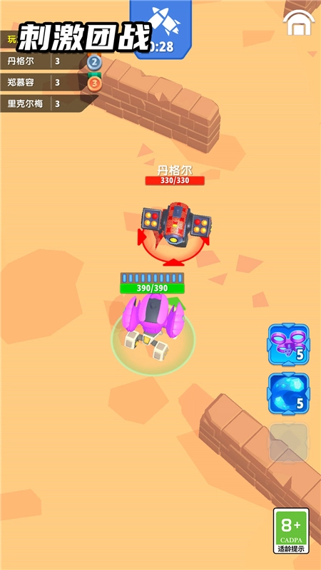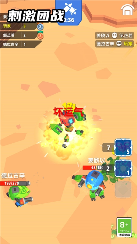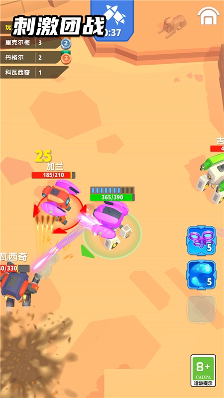 团队对抗:两队对抗,争夺资源并消灭敌方机甲。