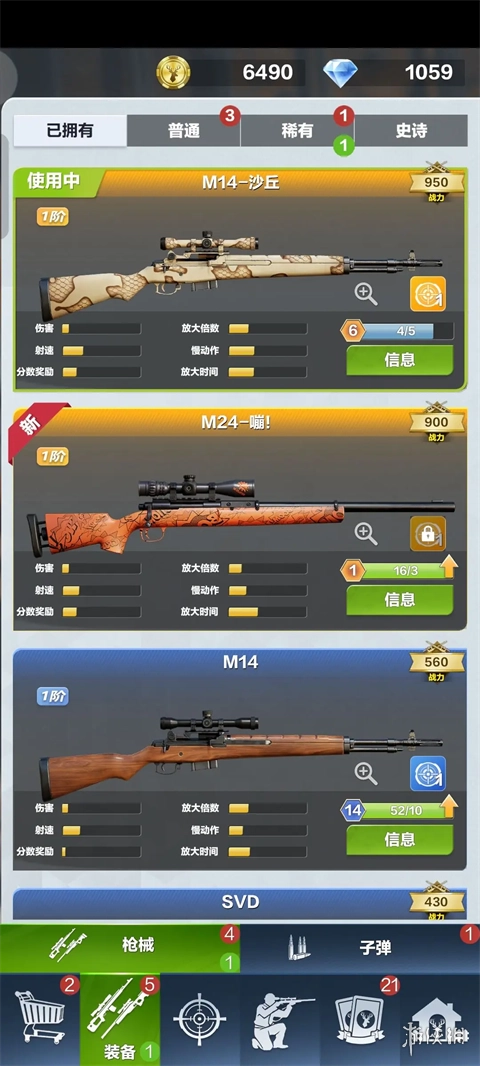 装备界面包含枪械与子弹两大板块,用户可在此查阅枪械和子弹的详细信息及获取要求,而后续的保养维护与升级操作同样在此界面完成。