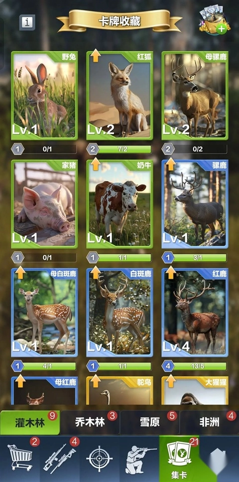 游戏里专门设置了集卡系统,能让猎友们更方便地收藏动物卡牌。每次进行狩猎活动,都有一定概率得到卡牌碎片,这些碎片可以用来解锁对应的动物卡牌。