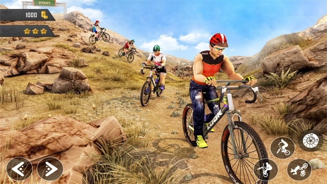 第一个视角呈现的是山地车越野模拟器。在这款登山野外赛车游戏里,你需要骑着山地车穿梭于多样地形之间,除了蜿蜒崎岖的山路,还有雪地等特殊地形等待你去征服挑战。