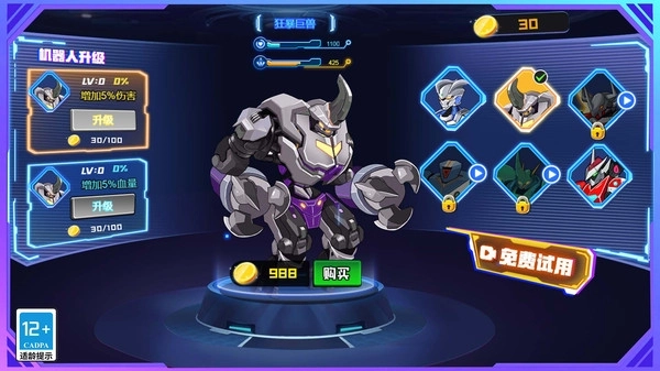 1、解锁六款各具特色的机甲,其中重型机甲主打防御能力,轻型机甲则在连击方面表现突出,玩家能够借助战斗获得的收益来强化机甲的核心属性。