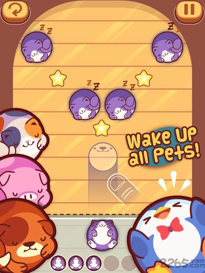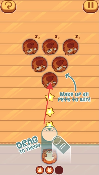 拖动保龄球(DRAG TO THROW),瞄准箭头所指的沉睡宠物,释放后使其撞击,借助星星轨迹,一次性唤醒多只宠物,从而高效推进关卡。