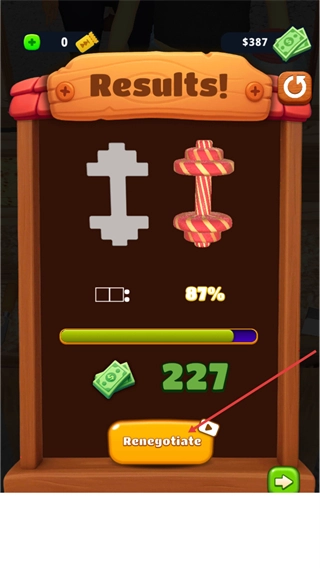 这个界面上显示着Results,你能清楚看到制作物品的完成进度是87%,同时还能获取227货币作为奖励。要是对当前结果不太满意,你可以点击Renegotiate按钮进行重新协商,完成这一步后就能顺利进入到下一个环节了。