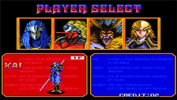 4、该游戏以当时主流的横版动作闯关玩法为基础,支持1-2名玩家同玩,在这不但拥有魁、布鲁内特、天狗、凯奥特四大初始化角色供你选择。