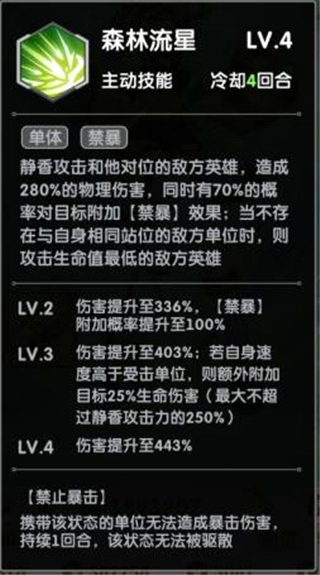 二技能名为“森林流星”。当该技能升至满级后,会对敌方与自身处于对位状态的英雄造成443%的物理伤害,并且附带禁暴效果。要是自身的速度比受击单位快,还会额外附加相当于目标25%生命值的伤害;要是没有对位的英雄,就会攻击敌方生命值最低的单位。这个技能可以说是单体爆发伤害最高的技能了,被它命中的英雄基本都会阵亡。