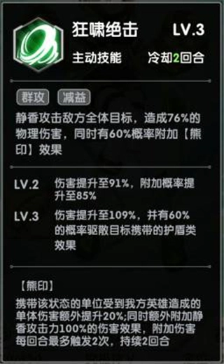一技能:狂啸绝击。此技能为全体攻击型,满级状态下能对敌方全体造成109%的伤害,并有60%的概率为目标附加熊印效果,同时以60%的几率驱散目标身上的护盾。熊印效果的作用在于,可为我方单个角色提升20%的伤害,此外还会额外附加相当于静香100%攻击力的伤害,且每回合这种附加伤害最多触发2次。不得不说,这个技能堪称挂buff的神技,它不仅能为我方增加伤害,还具备驱散护盾的效果,实力相当强悍。