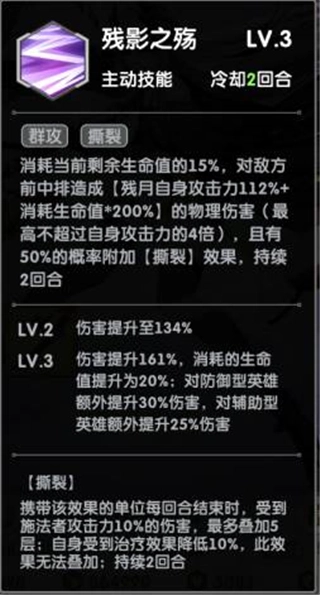 一技能「残影之殇」:满级状态下会消耗自身当前20%的生命值,对敌方前中排目标造成相当于自身攻击力161%加上消耗生命值200%的伤害,该伤害最高不超过自身攻击力的4倍;若目标为防御型英雄,伤害额外提升30%,辅助型英雄则额外提升25%,同时有50%的概率附加撕裂效果。这个技能堪称月河一技能的进阶形态,与碧荷一技能搭配使用时,能够实现对敌方全体的覆盖打击,输出伤害相当可观。