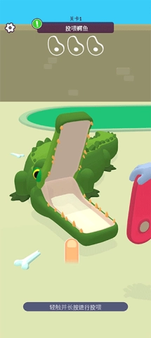 第一关,轻触并长按喂食鳄鱼,耐心等待鳄鱼生气的小表情消失后再进行投喂。