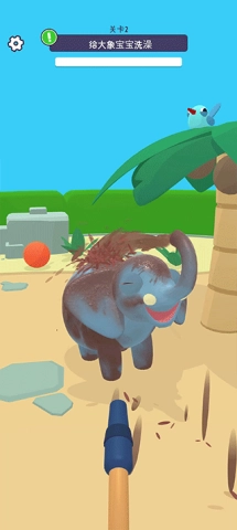 第二关,给可爱的大象宝宝洗澡,长按水枪,确保水流覆盖到的小象每一个角落!