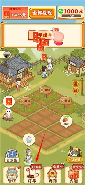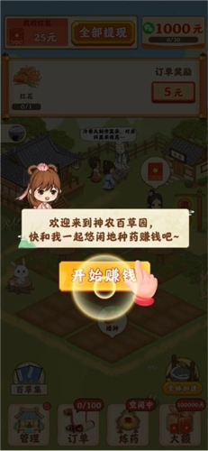 2、进入游戏后点击【开始赚钱】,然后点击空地种植草药。