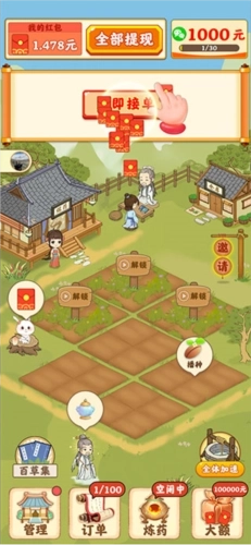 神农百草园红包版是一款超级好玩的模拟经营类游戏。在游戏中,你将经营一家草药园,挑战各种各样的任务,解锁更多草药,收集更多百草图鉴。游戏的玩法比较简单,你只要每天浇水施肥,就有机会获得超多的红包奖励,直接提现到微信。除此之外,你还可以自己炼丹,体验药材炼制。感兴趣的玩家不要错过这款游戏,快来体验一番吧!