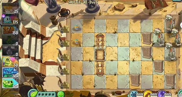 开局先按常规种向日葵积累阳光,墓碑吞噬技能冷却好了就用。开局先观察哪一路会来僵尸,先种一棵橡木弓手进行防守,接着攒阳光把最后一排都种满橡木弓手。