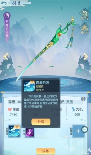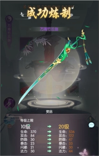炼制好的剑灵会放入宝囊之中,选择对应的剑灵可进行培养,剑灵等级到达上限后可以消耗材料进行再次炼制突破等级上限。