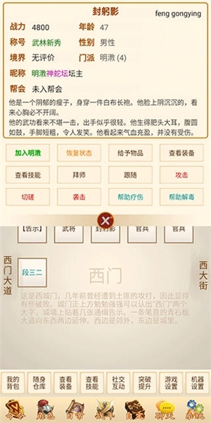 6、找到引导中的封躬影这个角色之后,点击他,就会出现加入明教和拜师的选项了。