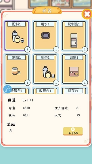 4、点击“机器”选项,能够持续升级储存台、收银台这类设备,从而加快店内奶茶的制作出杯效率。
