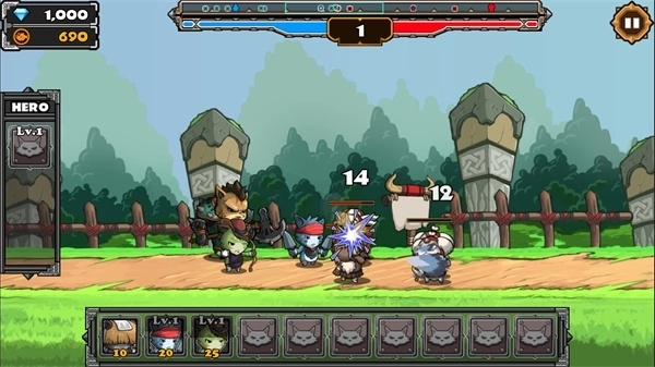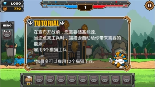 6、为了对抗强悍的魔神,训练猫族战士,雇佣喵星英雄,合理搭配远近兵种、把握时机释放英雄技能消灭敌军,保护好我方营。