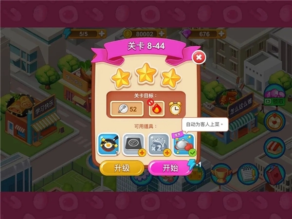 以8-44这一关卡为例,玩家可以借助一个“上菜小助手”来减轻操作负担——要是发现食材短缺就及时补充制作,而上菜的环节完全可以交给这个助手来处理。
