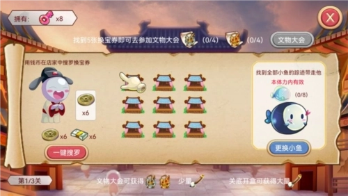 走进商店里,收集换宝券,集齐n张换宝券后就能参加文物大会。