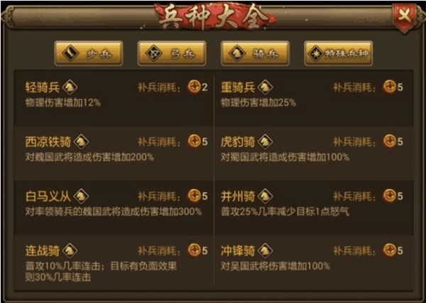 1、对吴将伤害增加100%骑兵系