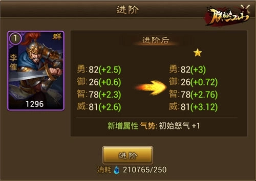 所有武将都能通过消耗武魂进阶,并大幅提高武将的属性。不由得感叹:橙将诚可贵,武魂价更高,想变强,刷武魂!