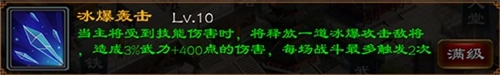 冰爆轰击,防守反击型技能,满级后在主将受到技能伤害时会给予3%武力+400的伤害反弹,每场战斗最多触发两次。中规中矩的一个技能,适合应对小技能型的智将,适用性并不广,但由于是冰爆攻击,附带减速,所以在追击战中比较好用。
